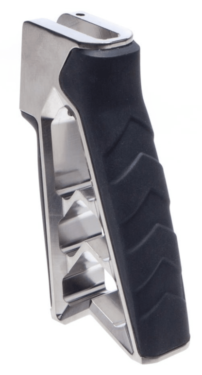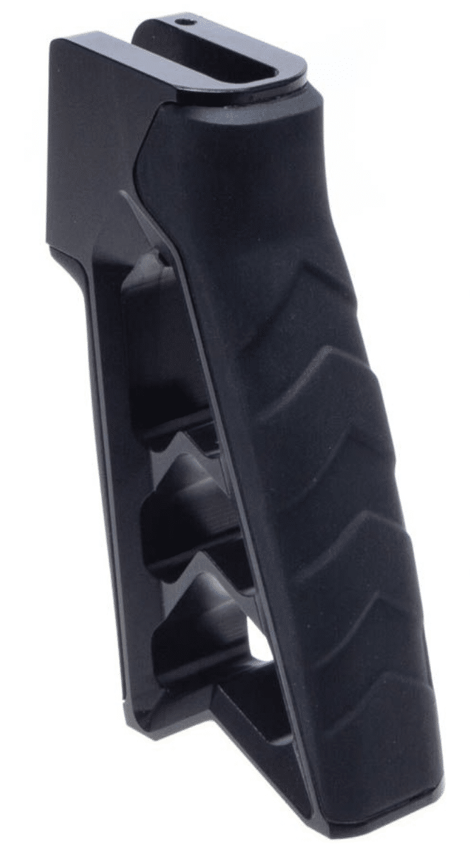 There is no compromise when it comes to the MOD v2 aluminum pistol grip. It has the beautiful craftsmanship of a machined aluminum grip, with the ergonomics of a sturdy rubber grip. With its 15 degree reduced angle you can operate your AR all day with no concerns for fatigue.